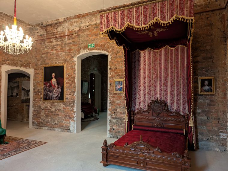 Nachdem das Schlafzimmer im Haupttrakt bereits Ende 2023 ein großes Rokokobett erhielt, fehlt seitdem noch ein Bettbaldachin mit entsprechenden Vorhängen. Während nach langem Suchen ein Bettkranz gefunden wurde, der farblich und stilistisch zum Bett passt, stellt die Anfertigung des Baldachins selbst eine große Herausforderung dar.