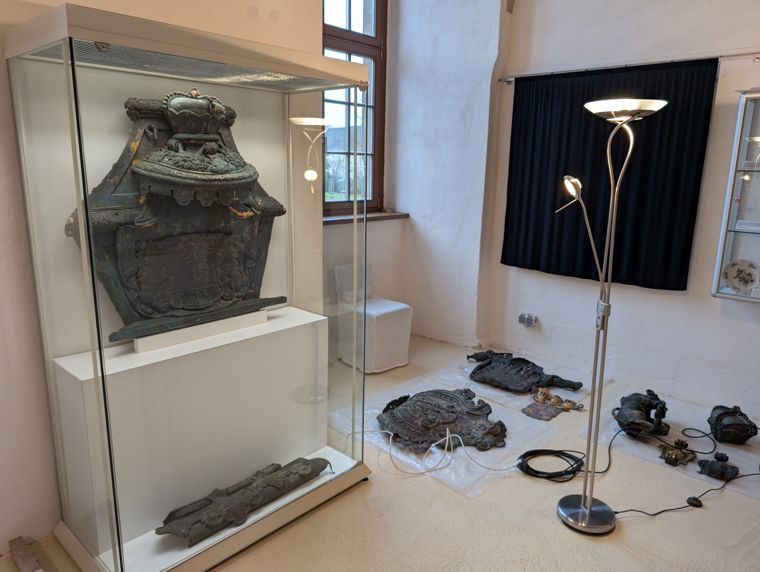 Der neu gestaltete Ausstellungsraum II im Erdgeschoss des Ostflügels konnte von den Besuchern zum Saisonbeginn erstmals in Augenschein genommen werden. Drei neue Vitrinen mit Spolien der Fürstensärge sowie eine Metallschild mit fürstlichen Initialen und ein hölzernes Wappen kamen neu hinzu.