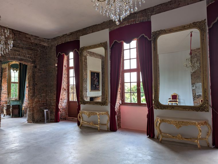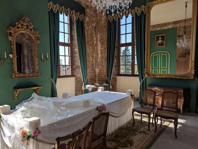 Das erst 2022 im Rohbau wiedererstandene und bisher recht spartanisch eingerichtete Hauptaudienzzimmer, das einst von Fürstin Johanna Elisabeth im Rokokostil umgestaltet und später von ihrer Schwiegertochter Caroline genutzt wurde, erhielt mit der Aufstellung einer Sitzgarnitur eine wesentlich Aufwertung.