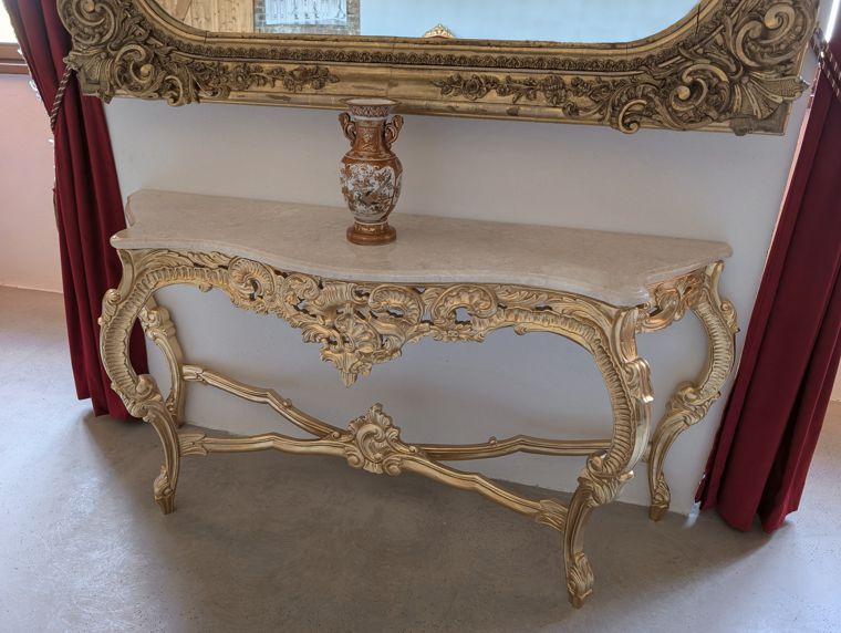 Dem historischen Schlossinventar des ausgehenden 18. Jahrhunderts entsprechend erhielt das Audienzgemach im Appartement der Fürstin Johanna Elisabeth zwei Konsoltische im Stil des Neorokokos. Durch die Größe der vorhandenen Wandspiegel darüber war es sehr schwierig, entsprechend große und bezahlbare Tische zu finden.