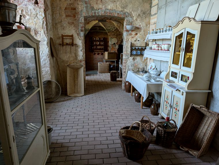 Auf Grund der problematischen klimatischen Verhältnisse im Kellergeschoss des Haupttraktes kann die Schlossküche den Besuchern in der Saison nur für kurze Zeit präsentiert werden. Nach der Säuberung aller Objekte wurden diese sukzessive auf dem Fußboden, auf Tischen und in Schränken sowie auf dem Herd aufgebaut.