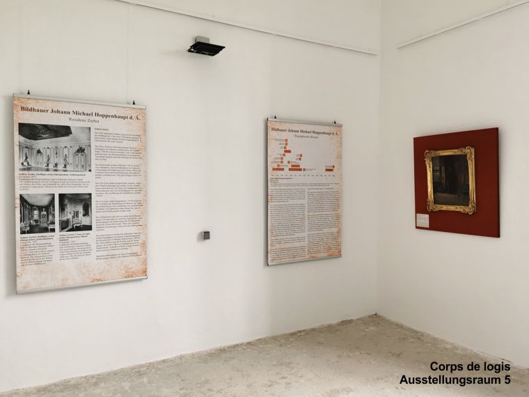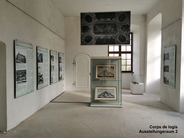 The first room is dedicated to the history of the residence. The castle complex, the history of construction and use of the baroque palace, the destruction in 1945 and the demolition of castle wings as well as the decay of the ruins and the reconstruction by the Förderverein are depicted. In addition, biographical sketches and the oeuvre of the Dutch master builder and engineers Cornelis Ryckwaert can be seen.