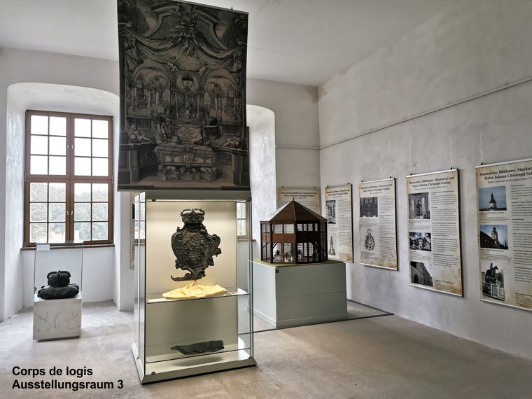 The most extensive traces in the design of the baroque residence were left by the master builder, sculptor, plasterer and painter Johann Christoph Schütze from Saxony. This all-rounder, whose oeuvre is presented in the third room, possessed enormous artistic versatility. The high quality of his plans, executed buildings and decorations make him a special architect personality of the Baroque period.