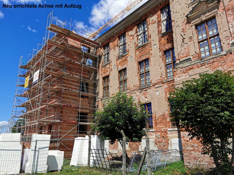 Die Errichtung eines Aufzuges zur Schaffung des barrierefreien Zugangs zu allen Schlossetagen war aus technologischen und denkmalschutzrechtlichen Gründen nur im nordwestlichen Teil des Schlosses möglich. Dazu wurde ein Gebäudeteil der östlichen Rücklage des Haupttraktes (eine Fensterachse) auf historischen Fundamenten neu errichtet und der Aufzugsschacht integriert. Mit dem Einzug von Stahlbetondecken im ersten und zweiten Obergeschoss sowie der Aufbringung eines Übergangsdaches erfolgte die Anbindung aller Etagen an den Aufzug. Für die Nutzbarmachung der neuen Räume wurden Fenster eingebaut.