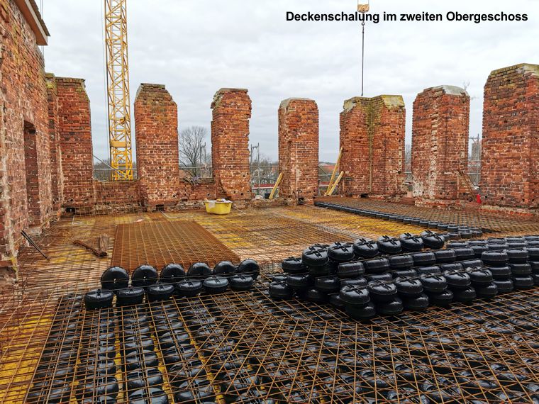 Für vier große Stahlbetondecken kamen wiederum Cobiax-Körper zum Einsatz, um das Eigengewicht zu minimieren. Zuganker zwischen dem Außenmauerwerk und den neuen Decken geben diesem Gebäudeteil die notwendige Stabilität. Die nächste Bauaufgabe besteht darin, weitere Stahlbetondecken südlich des Mittelrisalits einzuziehen. Dann sind die statischen Voraussetzungen gegeben, um über einen neuen Abschluss in Höhe des Hauptgesimses bzw. ein neues Dach nachzudenken.