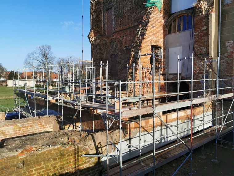 Zur Stabilisierung des neuen Mauerwerks im Bereich des zweiten Obergeschosses erhalten sämtliche Mauern einen Ringanker als Abschluss. Damit sollen Mauerwerksbewegungen verhindert werden. Nach der Wiederherstellung der Fensterstürze werden auch die Außenmauern mit einem Ringanker versehen.