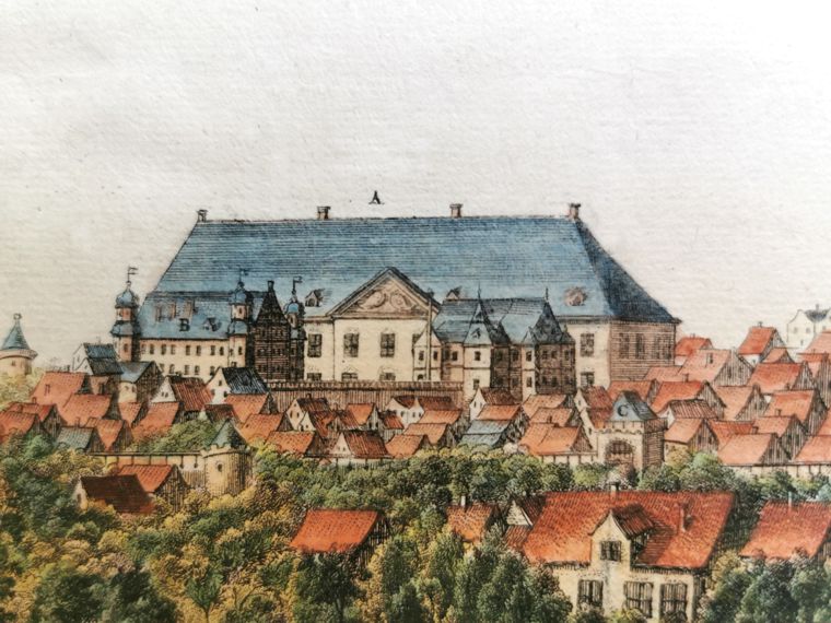 Für das Kupferstichkabinett als Bestandteil der unteren Ausstellungsräume des Ostflügels wurde nun der letzte noch fehlende Kupferstich aus den Geschichtswerken von Beckmann und Lentz mit einer Ansicht der Stadt um 1700 erworben. Auf dem altkolorierten Stich sind der neue Schlosshaupttrakt und Burggebäude zu sehen.
