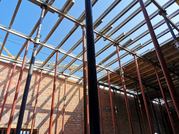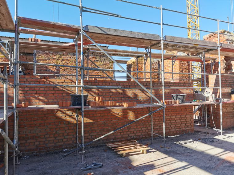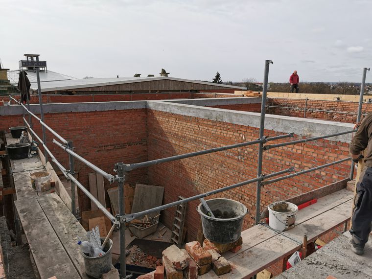 Die Mauern im zweiten Obergeschoss des Corps de logis haben fast überall ihre volle Höhe erreicht. Nur im Bereich der Außenmauern wird noch gearbeitet. Nach Abschluss dieser Tätigkeiten beginnt die Herstellung der Schalung für die neue Betondecke, die dann mit Bewährung versehen gegossen werden kann.