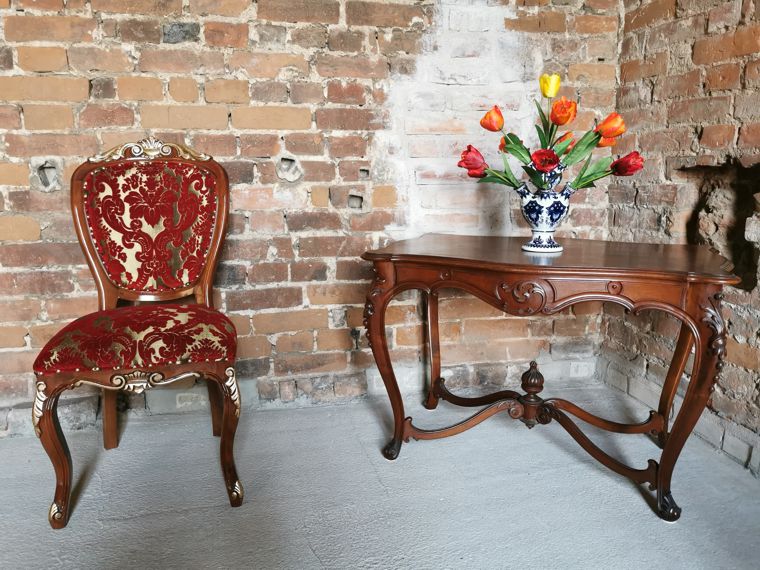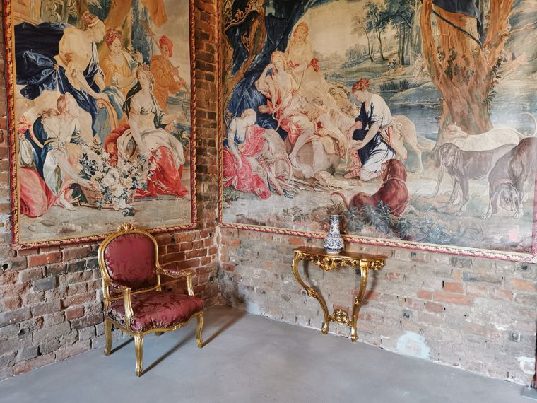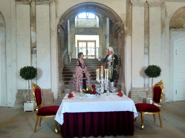 Mehr als ein Jahr hat die Sonderanfertigung von neuen Armlehnstühlen gedauert, die jetzt ihren Platz im Entreesaal gefunden haben. Der Korpus der Stühle in Kirsche ist mit silbernen Schnitzereien verziert. Für die Bezüge kam der Stoff der Vorhänge zum Einsatz, um ein harmonisches, barockes Bild zu erreichen.