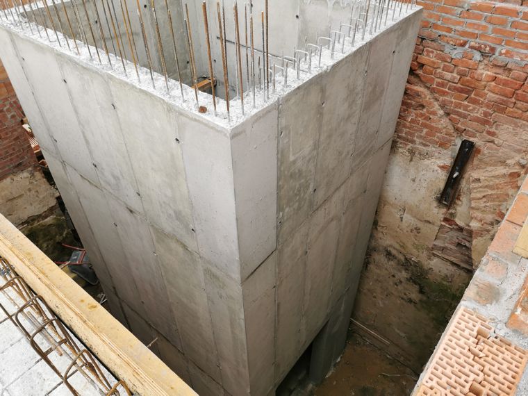 Nach der Herstellung der Schalung und der Stahlbewährung der unteren Hälfte des Aufzugsschachtes im zweiten Obergeschoss konnten die Wandpartien gegossen werden. Aus statischen Gründen steht der Schacht frei auf Bohrpfählen, die in den Boden eingebracht wurden, und ist nicht mit den historischen Wänden verbunden.