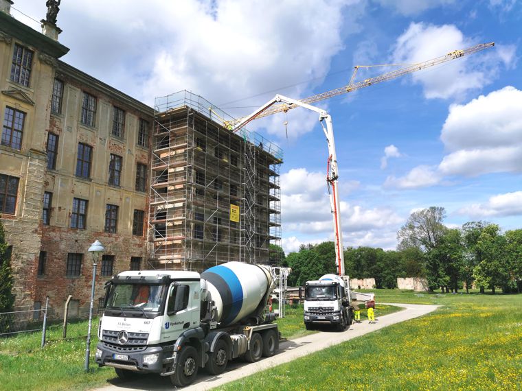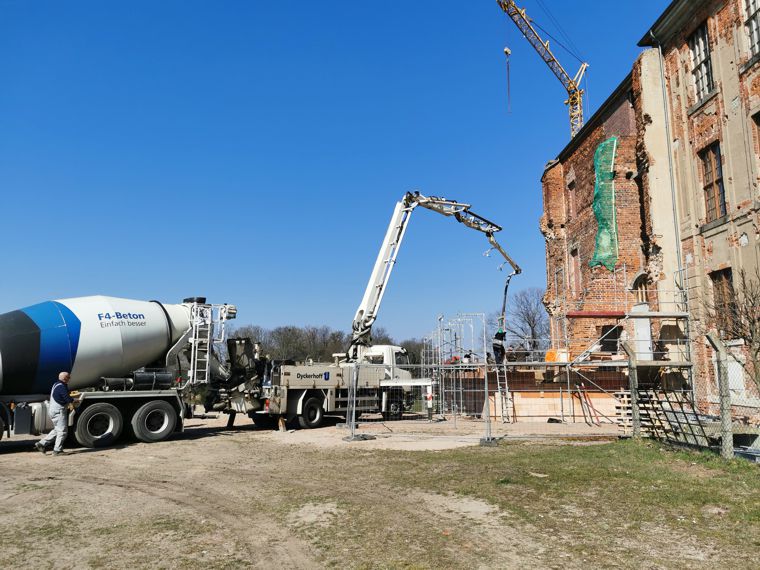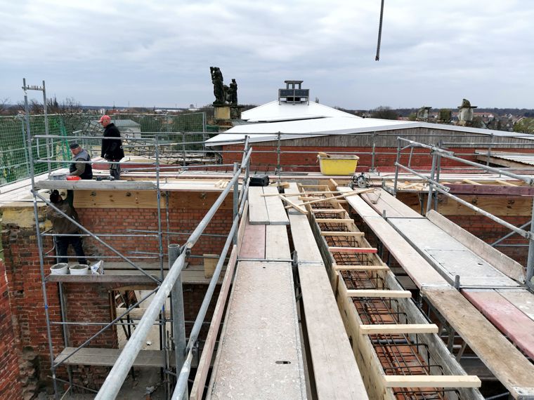 Eine sehr hohe Betonpumpe mit weit über 20 m Höhe war nötig, um die Abschlussdecke oberhalb des zweiten Obergeschosses gießen zu können. Für die Stahlbetondecke und die Hauptgesimse waren mehrere Lkw-Ladungen erforderlich. Damit hat der seit 1945 vollkommen ruinöse Haupttrakt wieder einen oberen Abschluss.