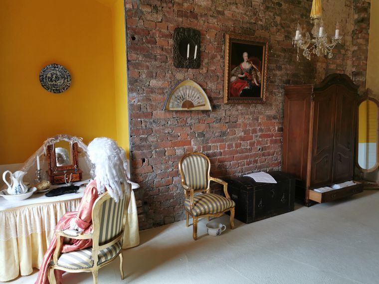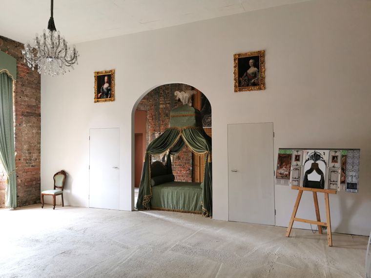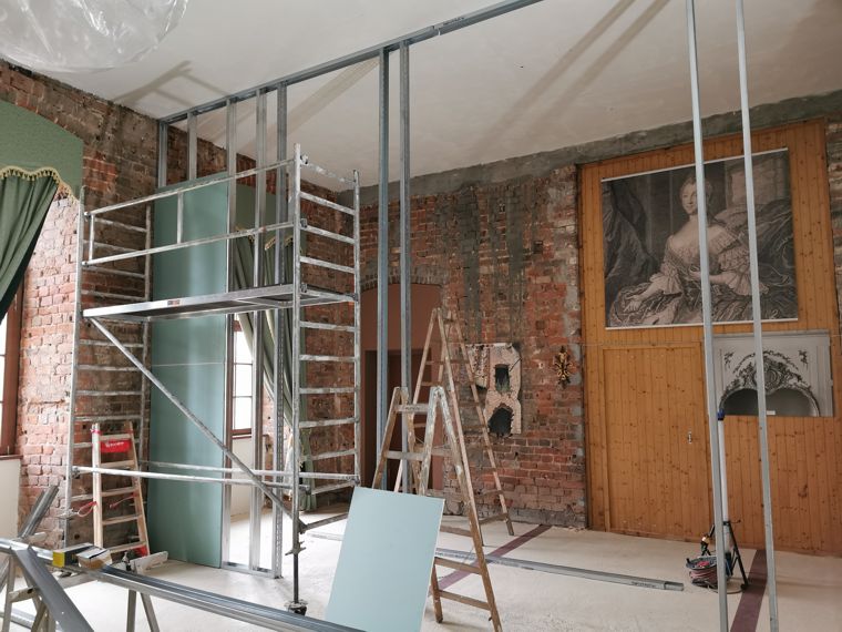 Im Frühjahr wurde an gleicher Stelle der 1945 verloren gegangenen Fachwerkwand eine neue Trockenbauwand mit historischer Gliederung errichtet. Die Wand trennt das Schlafzimmer der Fürstin vom Alkoven. Das Konzept zur Wandgestaltung wird im Winterhalbjahr 2022/23 umgesetzt, zwei Porträts erhielten aber schon ihren Platz.