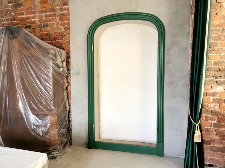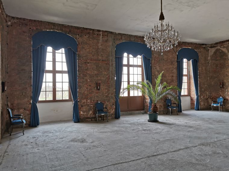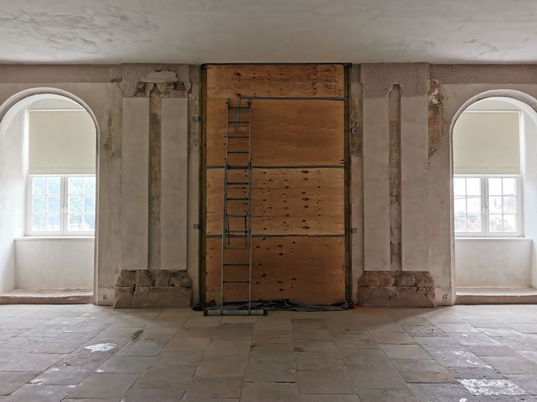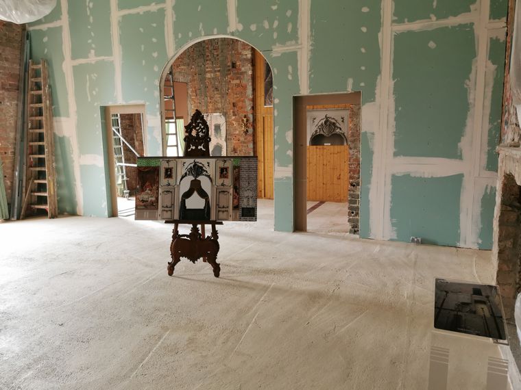 Vor dem Einbau der neuen Fenster im visualisierten Zedernkabinett im April 2021 mussten die in Gipskarton ausgeführten Fensterlaibungen abgerissen werden. Anschließend erfolgten der Wiederaufbau der Laibungen und das Verkleben der neuen Drucke. Die Vorhänge erhielten nun zum Raum hin neue Plätze.