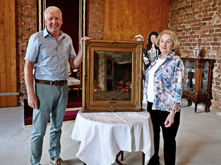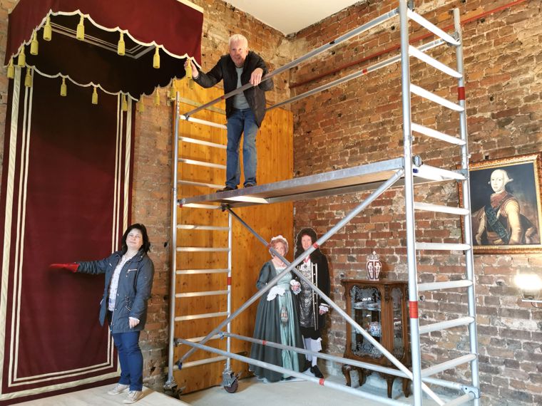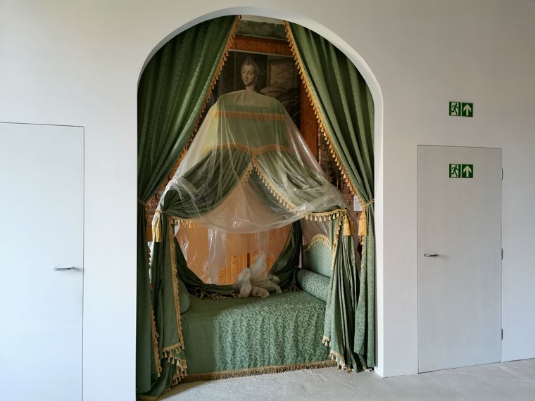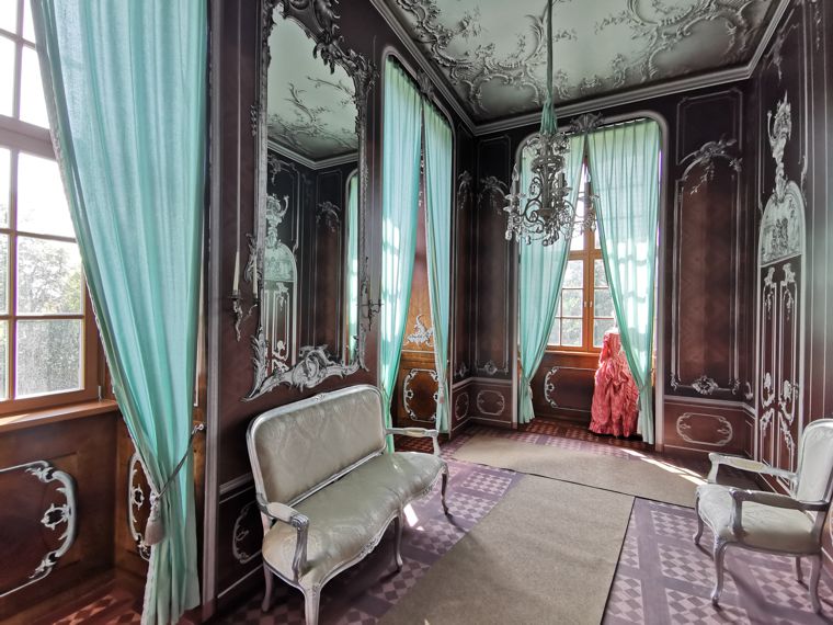 Die Visualisierung der Trennwand im Schlafzimmer wird erst nach Saisonende 2022 ausgeführt. Damit sich die Schlossbesucher bereits ein Bild vom zukünftigen Aussehen machen können, wurde eine Ansicht der bereits fertigen Wandabwicklung gedruckt und auf einer Staffelei aufgestellt.