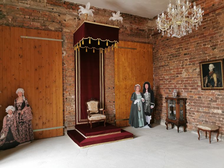 Pünktlich zum Start der Saison 2022 konnte der Thron im Audienzzimmer des Fürsten Friedrich August fertiggestellt werden. Nach Abschluss der Näharbeiten wurden die Einzelteile an die schon mehr als zwei Jahre vorhandene Unterkonstruktion angebracht. Die Besucher können die ehemalige Raumfunktion gut nachvollziehen.