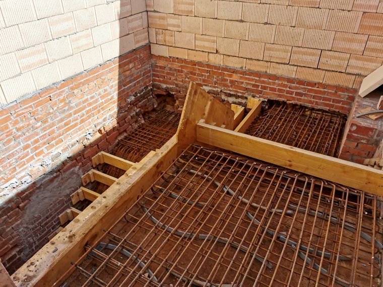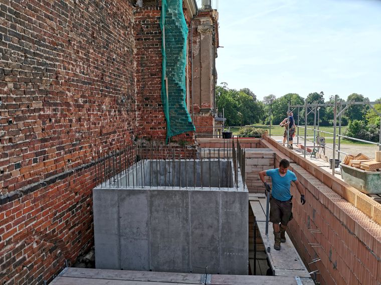 Das Aufmauern der Außenwände im Westteil des Corps de logis nach historischem Vorbild war die Grundlage für die Herstellung der Bewährung für die Decken oberhalb des Kellergeschosses. Damit ist die untere Etage wieder komplett. Bis zur Dachebene werden noch drei weitere Decken entstehen.