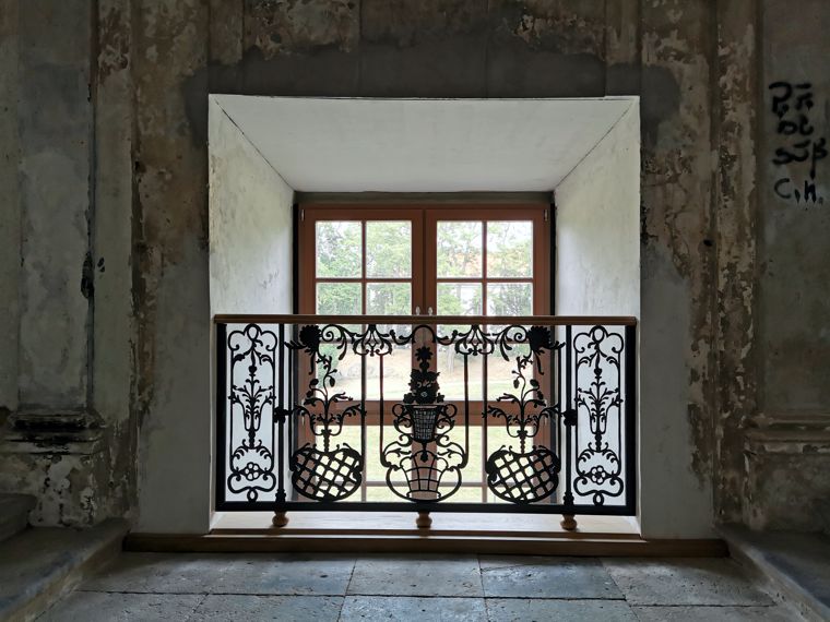Eine von vielen Auflagen des Bauordnungsamtes des Landkreises bestand in der Herstellung von neuen Gittern im Haupttreppenhaus des Ostflügels. Die bisherigen Handläufe und Sicherungen, die 19 Jahre ihren Dienst ohne Vorfälle taten, reichten plötzlich nicht mehr aus. Nun erscheint das barocke Treppenhaus wie das in einer Strafanstalt.