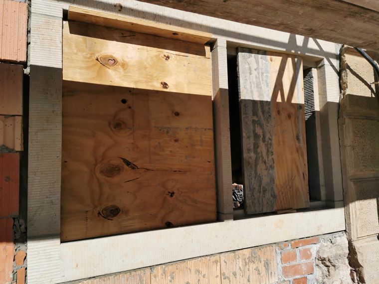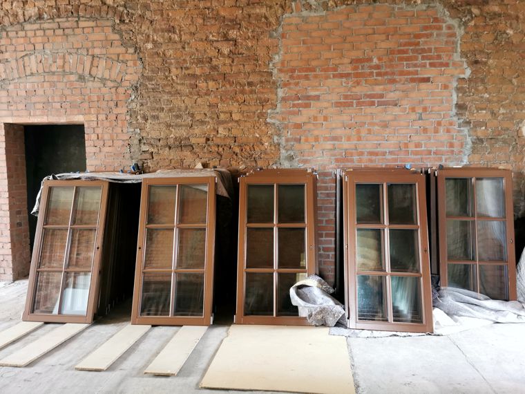 Sämtliche Fensteröffnungen des ersten und zweiten Obergeschosses des Haupttraktes und alle Öffnungen des neuen Anbaus vom Keller bis zum zweiten Obergeschoss erhalten Fenster nach historischem Vorbild analog der unteren beiden Etagen. Rahmen und Fenster harren nun dem Einbau nach Fertigstellung des Daches.
