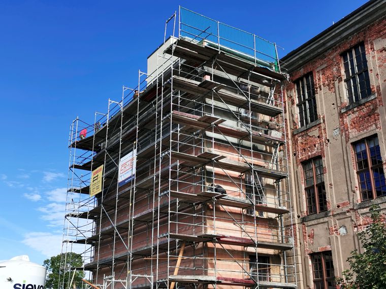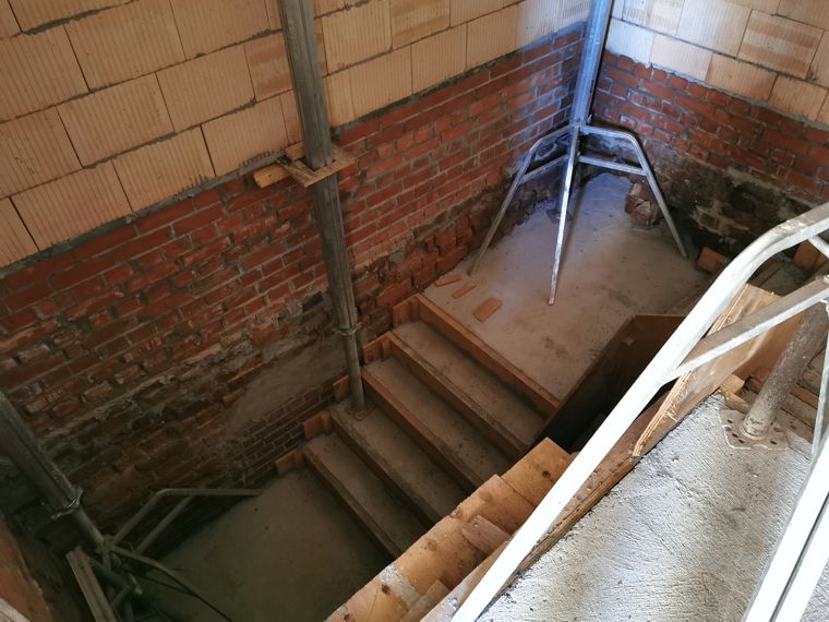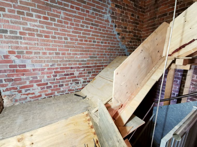Im Rahmen des Großprojektes "Umsetzung des kulturellen Nutzungskonzeptes" erfolgte nun die finale Erweiterung der Treppe bis zur Dachebene. Dazu mussten die Schalungen für die Treppenläufe und Podeste sowie die Stufen angelegt werden. Darin wurden anschließend die Stahlarmierungen integriert.