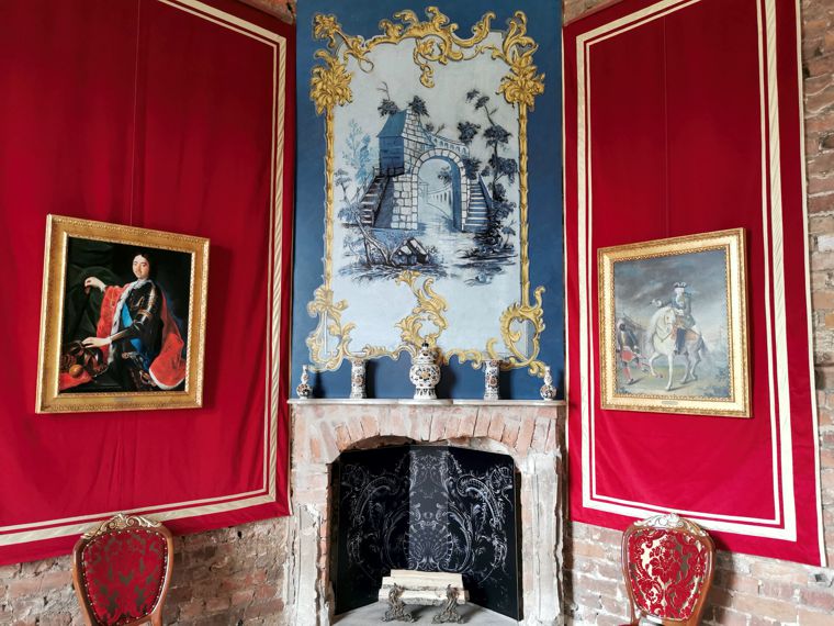 Nach einem Monat Arbeit konnte die Montage der sechs Wandbehänge im Vorzimmer des Fürsten Friedrich August abgeschlossen werden. Bis auf die Fläche, die der ehemalige Ofen einnahm, sind die Wände nun mit rotem Samt verkleidet. Goldene Tressen umschließen die Felder mit Porträts und Spiegeln.
