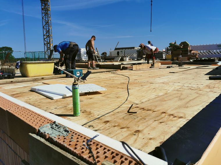 Das Setzen des ersten Dachbinders markiert den Beginn der Montage des Dachstuhls. Das Übergangdach wird verkleinert die Form des 1945 zerstörten, um ein Vielfaches höheren Daches aufnehmen. In den Dachinnenbereich wird auch eine Isolation integriert, um perspektivisch die ganzjährige Nutzung des Schlosses zu ermöglichen.