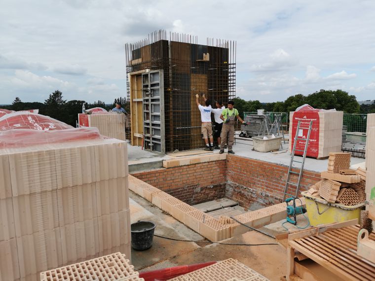 Der Schacht für den Aufzug muss für den letzten Halt auf der Dachebene erweitert werden. Die Herstellung der Schalungen und der Stahlarmierungen sind die Grundvoraussetzungen für das Gießen der Wände in Beton. Danach erfolgen dann noch die Erweiterung für die Überfahrt und den Rauchabzug.