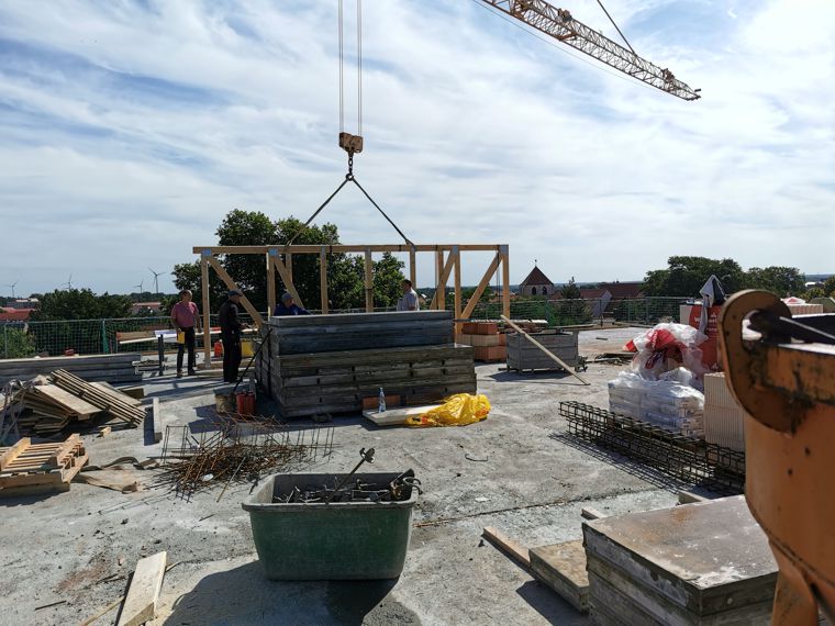 Stück für Stück wächst der Aufzugsschacht von der Unterfahrt im Keller empor. Jetzt wurden die Betonarbeiten im Erdgeschoss abgeschlossen. Der Aufzug, der alle Etagen vom Keller bis zur Dachebene erschließen wird, entsteht im Rahmen des Großprojektes in der Mitte des neu errichteten Gebäudeteils des Haupttraktes.