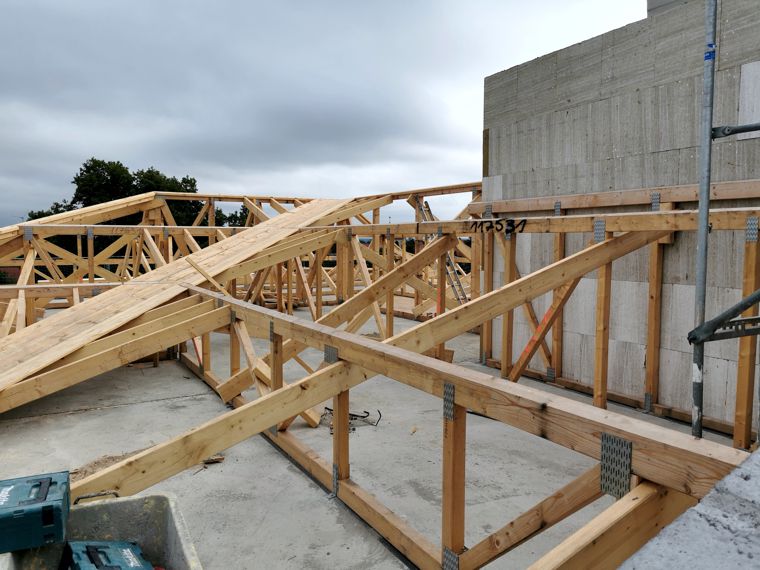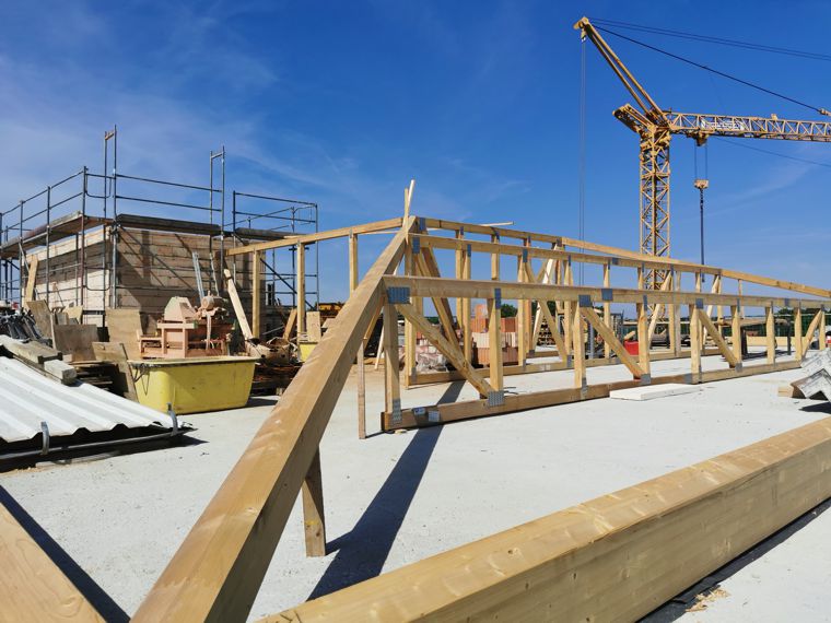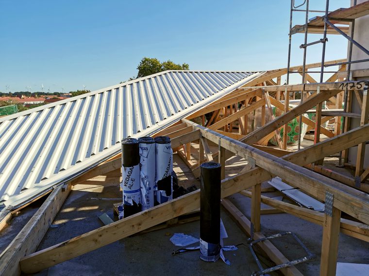 Mit fortschreitendem Bau treten die Firstlinien und die mit Trapezblechen zu bedeckenden Dachflächen immer deutlicher hervor. Es ist beeindruckend zu sehen, wie massiv der Dachstuhl sein muss, um das Dach zu tragen sowie viele Jahre Wind und Wetter zu trotzen. Nach Abschluss erfolgt die Dachmontage.