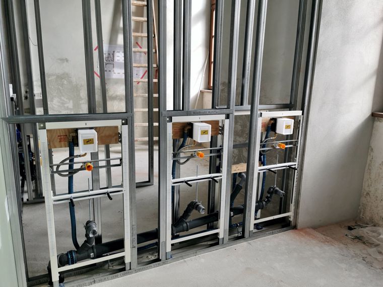 Der Trockenbau und die ersten Sanitärinstallationen gehen in der neuen WC-Anlage im ersten Obergeschoss des Ostflügels parallel einher. In die ehemalige Bibliothek des Fürsten Friedrich August werden drei Bereiche integriert: eine Damentoilette, eine Herrentoilette und ein barrierefreies WC.