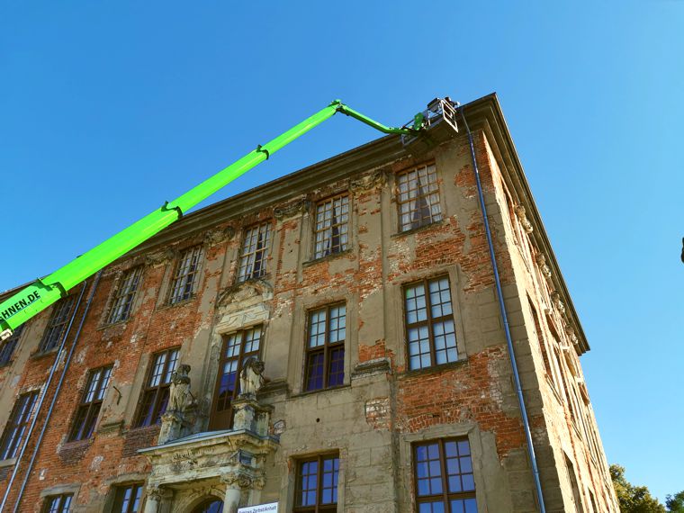 Im Rahmen des baulichen Großprojektes wird auch für das gesamte Schloss eine Blitzschutzanlage installiert, die von Amts wegen gefordert wird. Die Montagen in luftiger Höhe erfolgen mittels einer hohen Arbeitsbühne. Die Ableitungen wurden im Bereich der Dachrinnen nach unten geführt.