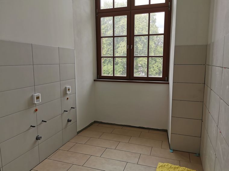 Die Komplettierung der WC-Anlage im ersten Obergeschoss schreitet mit der Fliesenausstattung an Boden und Wänden voran. Die Böden haben einen sandsteinfarbenen Belag erhalten, die Wände einen hellgrauen. Nach der Fertigstellung erfolgen die Montage der inneren Trennwände und der Sanitäreinrichtungen.