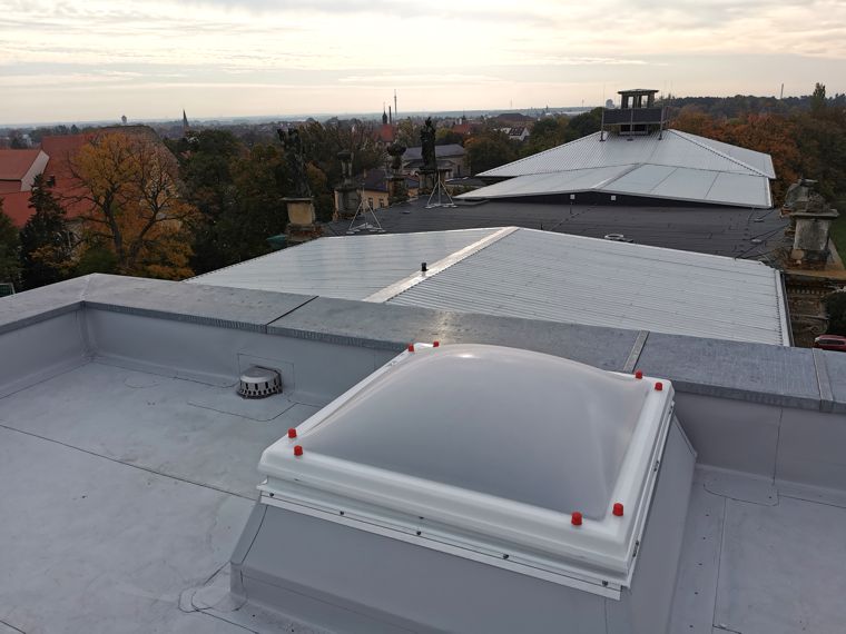 Im neuen Brandschutzkonzept sind auch Entrauchungen für das Treppenhaus im Haupttrakt und den Aufzugsschacht vorgesehen, die entsprechend umgesetzt wurden. Die Entrauchung über der Treppe ist als Lichtkuppel ausgeführt, die gleichzeitig Tageslicht hereinfallen lässt. Eine weitere Klappe entstand über dem Schacht.