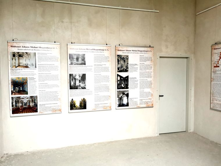 Die im August 2021 eröffnete Dauerausstellung zur Schlossgeschichte und zu den am Bau beteiligten Künstlern im Erdgeschoss des Haupttraktes wurde im Rahmen des Großprojektes um einen fünften Raum erweitert. Die Informationsbanner zum Bildhauer Johann Michael Hoppenhaupt d. Ä. erhielten dort ihren neuen Platz.