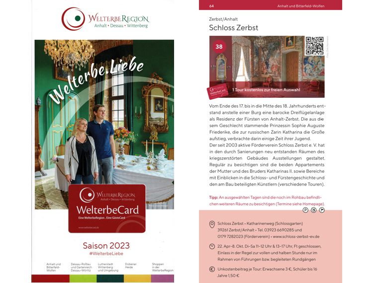 Im Rahmen des Förderprogramms des Bundes "Neustart Kultur" konnten die technischen Rahmenbedingungen für eine Teilnahme an der WelterbeCard der Region Anhalt, Dessau und Wittenberg geschaffen werden. Ab kommendem Jahr ist für Karteninhaber eine kostenlose Tour durch Ausstellungen im Schloss möglich.