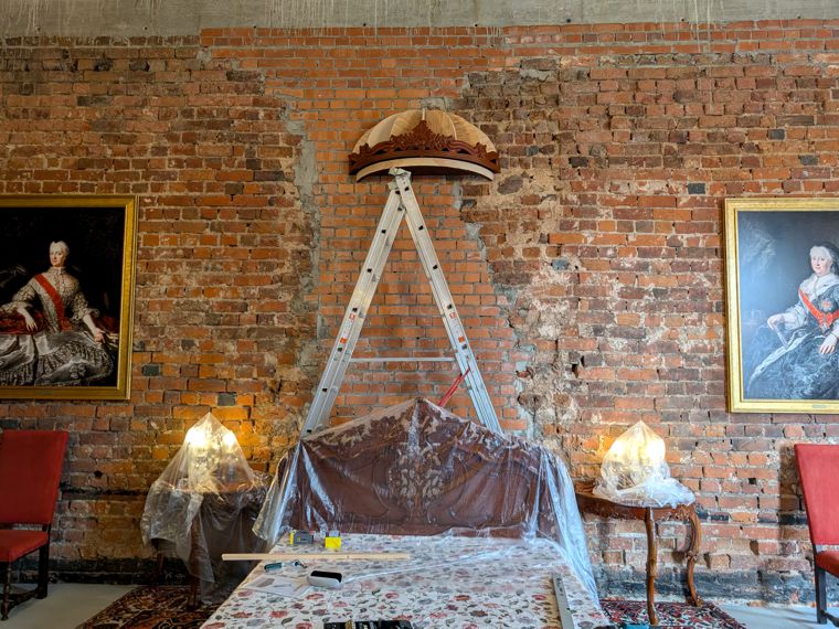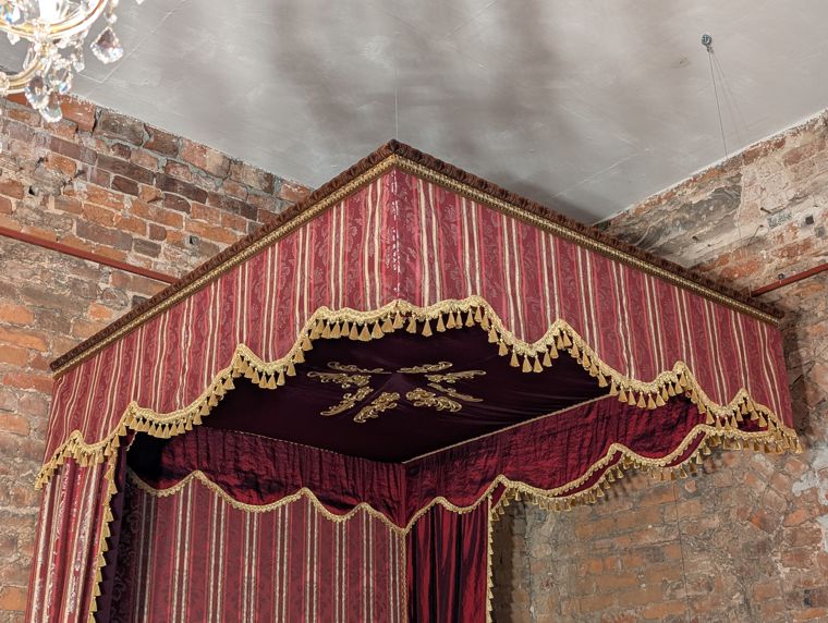 Nachdem das Schlafzimmer im Haupttrakt bereits Ende 2023 ein großes Rokokobett erhielt, fehlt seitdem noch ein Bettbaldachin mit entsprechenden Vorhängen. Während nach langem Suchen ein Bettkranz gefunden wurde, der farblich und stilistisch zum Bett passt, stellt die Anfertigung des Baldachins selbst eine große Herausforderung dar.