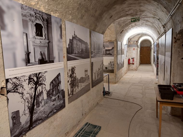 Die Präsentation der Sonderausstellung zum 80. Jahrestag der Zerstörung in den Schlosskellern, einem authentischen Ort des damaligen Geschehens, wurde ganz bewusst gewählt. Über 40 große Bild- und Texttafeln sowie Spolien der Zeit bieten einen Einblick in die dramatischen Ereignisse.