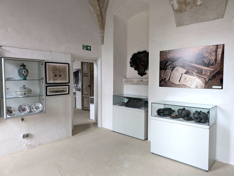 Der neu gestaltete Ausstellungsraum II im Erdgeschoss des Ostflügels konnte von den Besuchern zum Saisonbeginn erstmals in Augenschein genommen werden. Drei neue Vitrinen mit Spolien der Fürstensärge sowie eine Metallschild mit fürstlichen Initialen und ein hölzernes Wappen kamen neu hinzu.