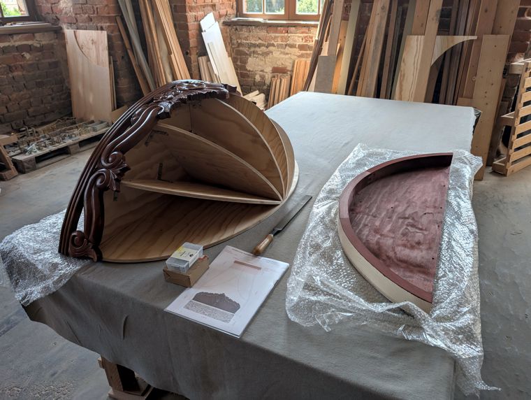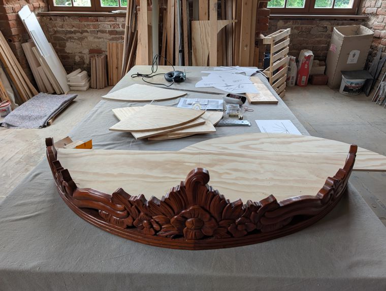 Der in Eigenbau entstandene Bettbaldachin für das Schlafzimmer der Fürstin Caroline Wilhelmine Sophie stellte inhaltlich-strukturell und handwerklich eine große Herausforderung dar. Nunmehr ist dieser im Rohbau fertiggestellt. Die oberen Rippen werden mit Stoff bespannt, unten hängen dann der Lambrequin und die Vorhänge dran.