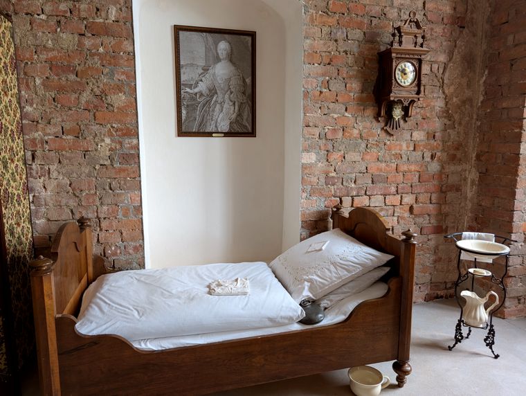 Im historischen Schlossinventar sind für das Schlafzimmer der Fürstin Johanna Elisabeth, das sie auch als Wohnzimmer nutzte, zwei große Zedernholzschränke mit verspiegelten Türen benannt. In Anlehnung daran wurde ein Schrank in barocken Formen erworben, der seinen Platz zwischen den beiden Fenstern fand.